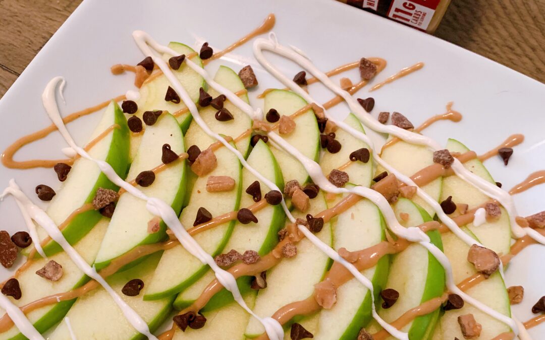 3. Top white chocolate, buckeye butter, chocolate chips, and toffee pieces onto sliced apples.