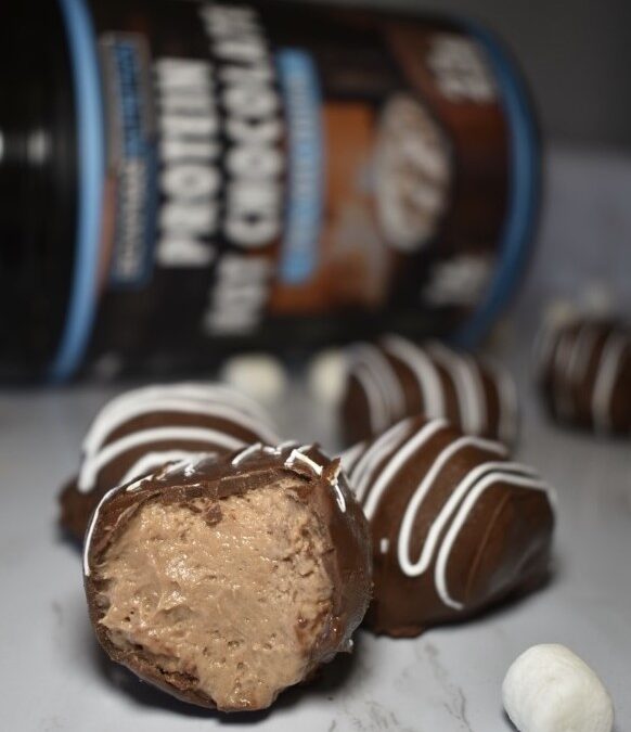 Combine whipped cream cheese, light butter, powdered swerve, protein hot chocolate, and vanilla extract in a bowl. Stick in the freezer for 30-60 minutes. Use a cookie dough scooper to scoop into 5 balls and place on parchment paper. If you try this with a spoon and your hands you’re probably gonna have a bad time. Once scooped, stick them back into the freezer for a few hours or until you are able to pick them up without them immediately melting in your hands. Now, you have to work fast. Melt down your candy melts in the microwave in 15- 30 second increments. DO NOT OVERHEAT THEM or it will have the opposite effect and it will begin to thicken. Heat for 30 seconds, stir vigorously, and repeat until it is thin enough to dip. Once ready, drop in your cheesecake truffles upside down. Flip over with a fork, coating the entire truffle. Lift and tap excess chocolate off before setting back on parchment paper to dry. If you want to be extra like me, take some of the melted chocolate and put it in a plastic sandwich ziploc bag, snip a tiny hole in the corner and drizzle more chocolate on top. Then just let them dry and ENJOY.